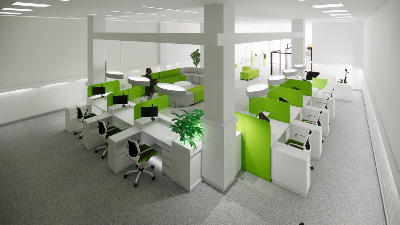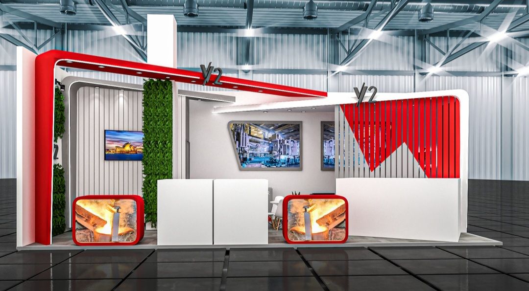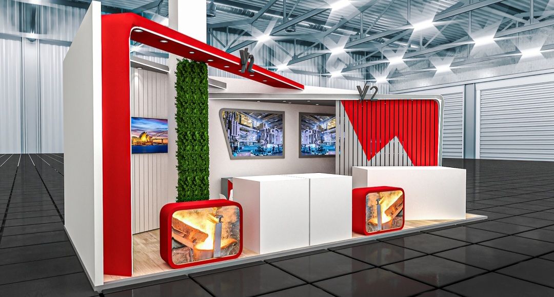 طراحی غرفه نمایشگاهی مدرن با پالت رنگی سازمانی شرکت کارفرما