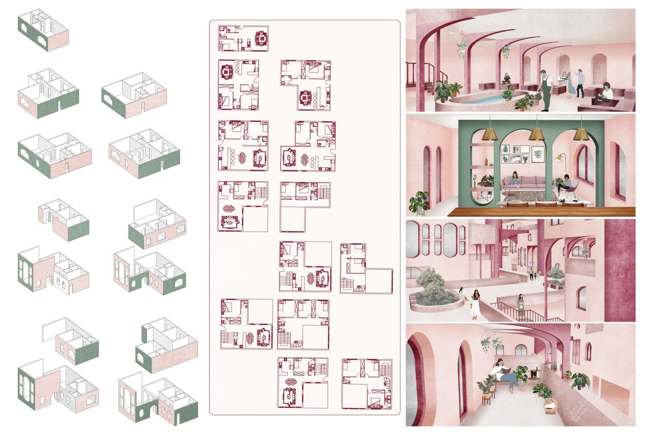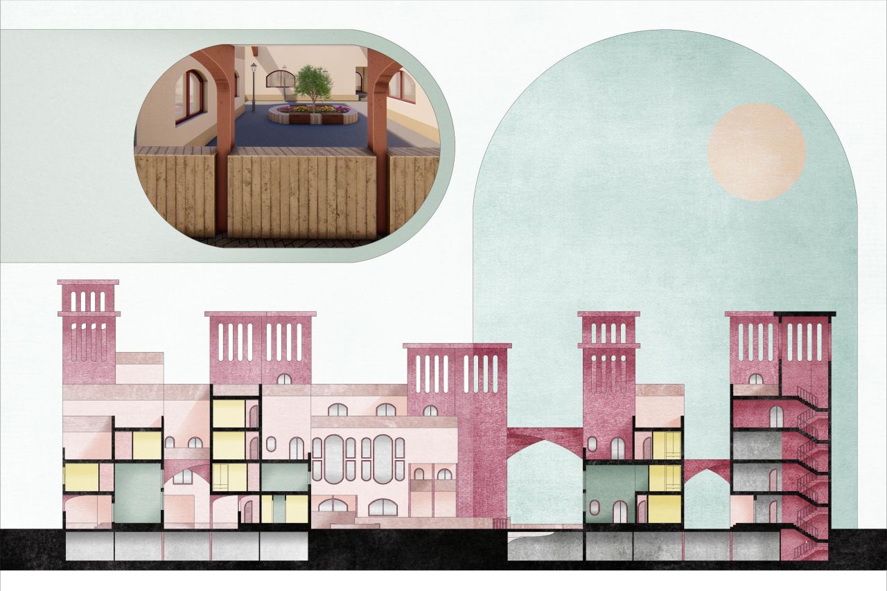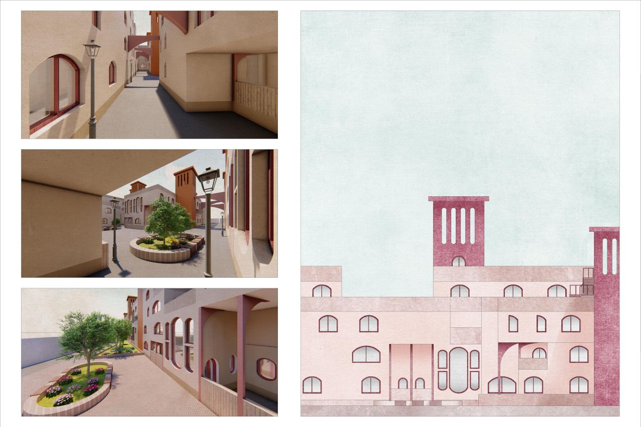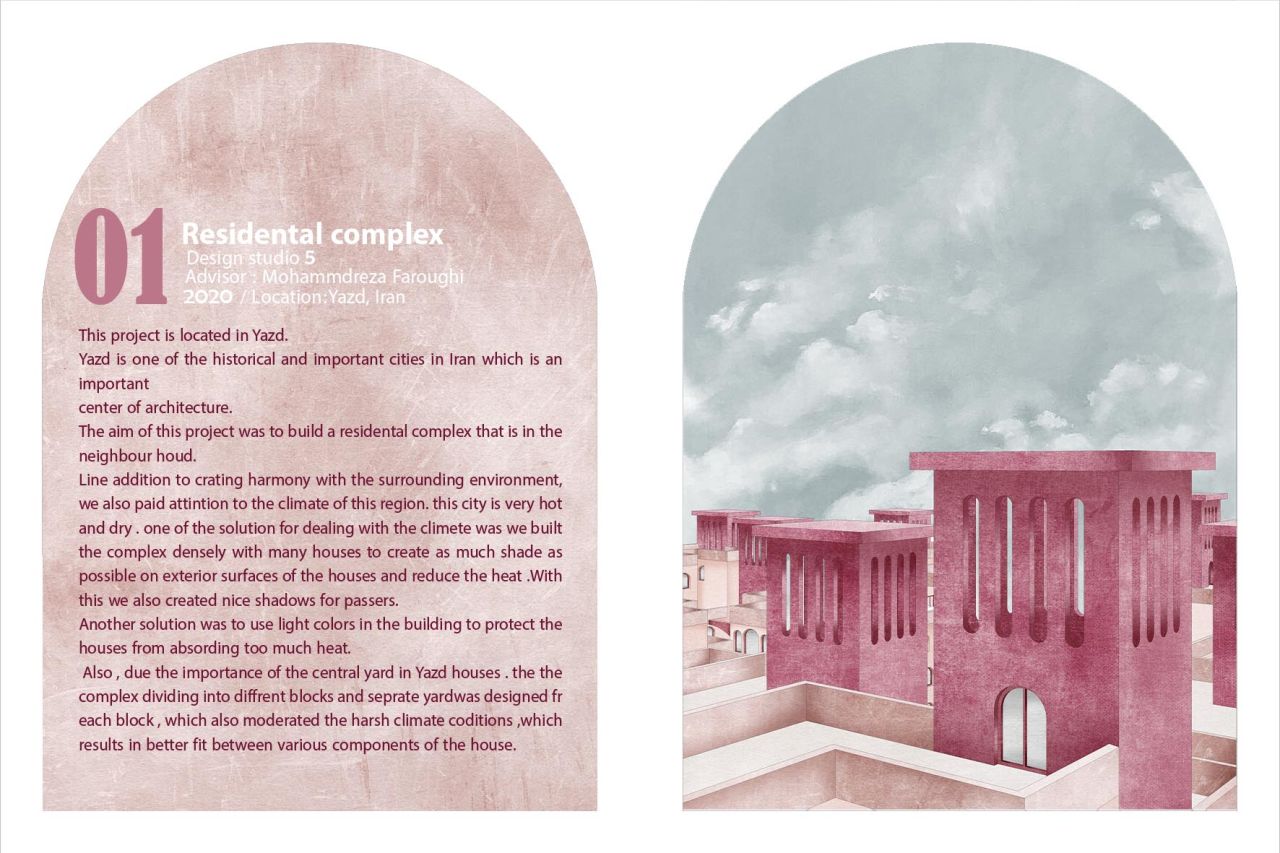 منطقه مسکونی با طراحی چند تیپ مختلف پلان در یک یا دو طبقه که معماری سنتی یزد تلفیق شده است.