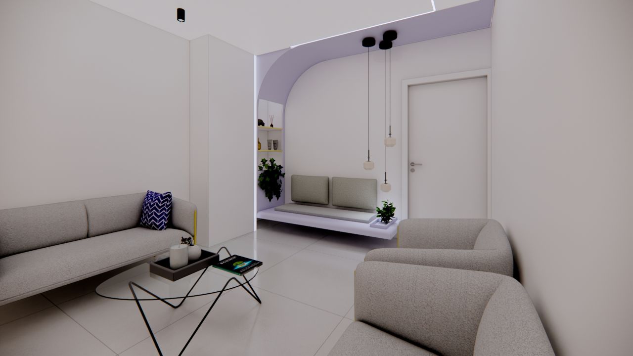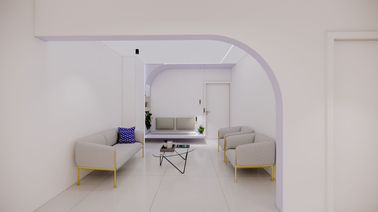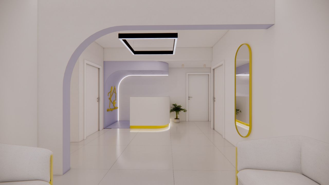 طراحی فضای داخلی کلینیک زیبایی، با درنظر گرفتن نظر کارفرما در استفاده از رنگ بنفش و پویایی فضا.