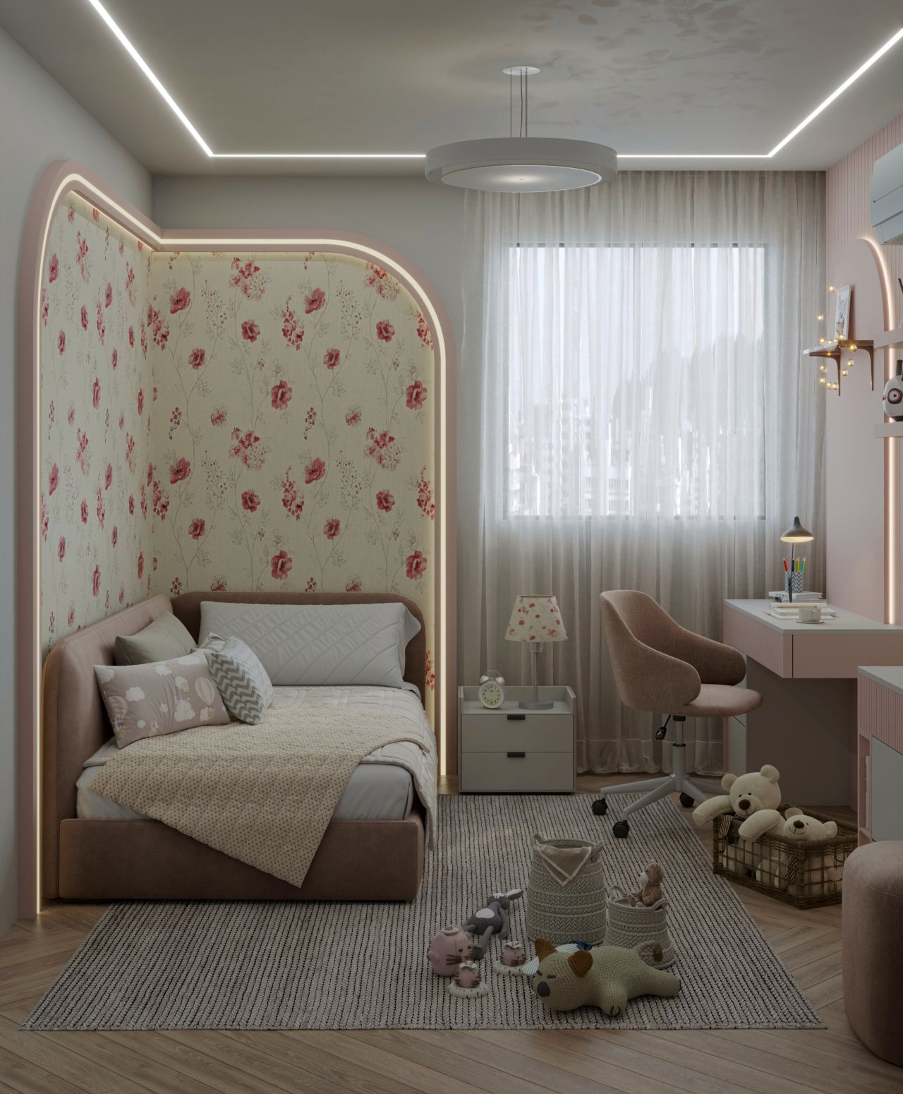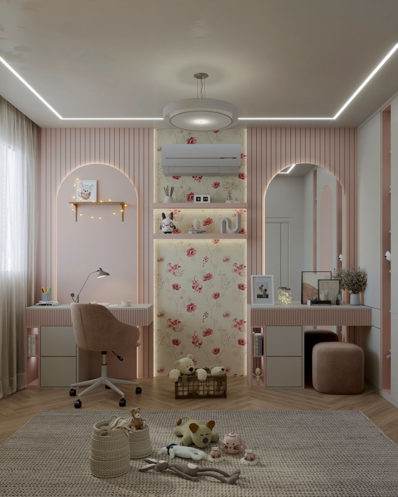 این پروزه طراحی اتاق خواب (دختر) در شهر تهران به متراژ 10 متر مربع است که سلیقه کارفرما رنگ صورتی و سفید بود که هم میز ارایش و هم میز تحریر برای اتاق خواب میخواستند.