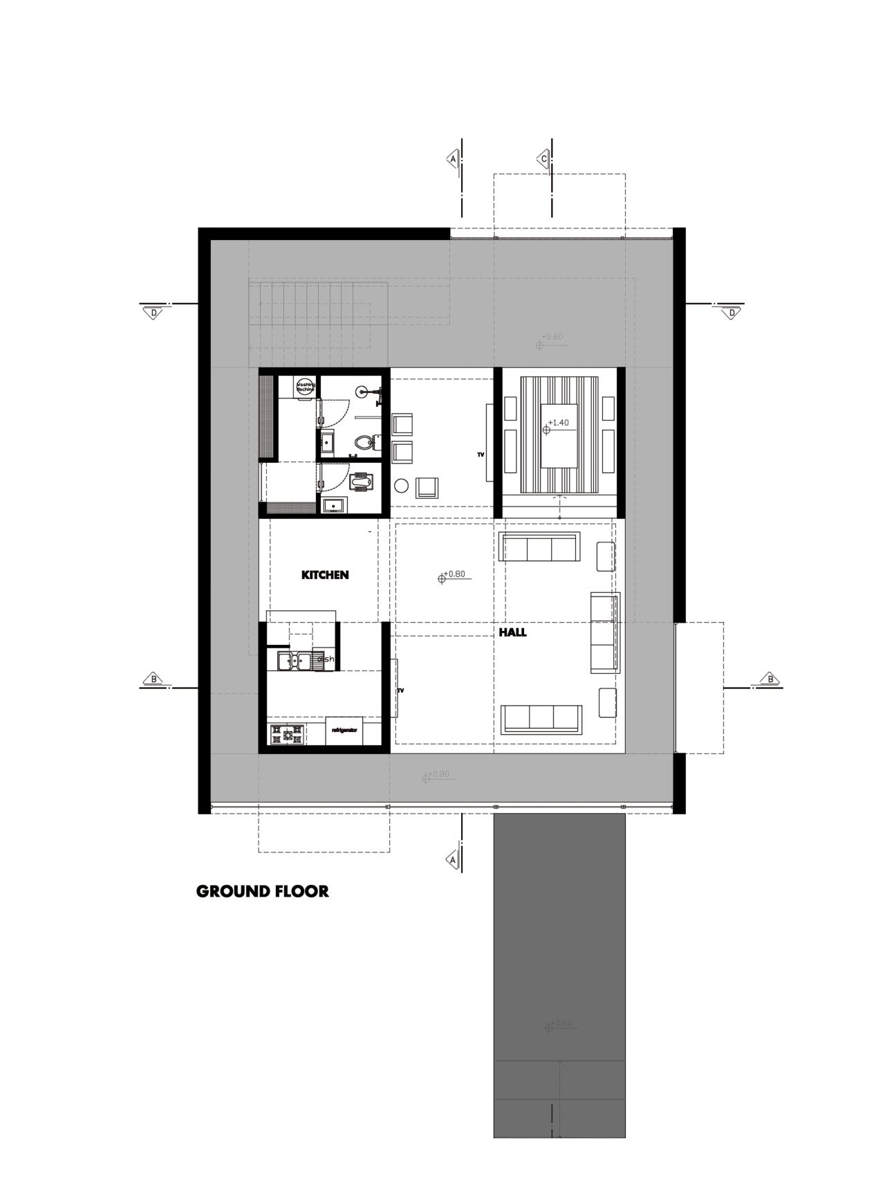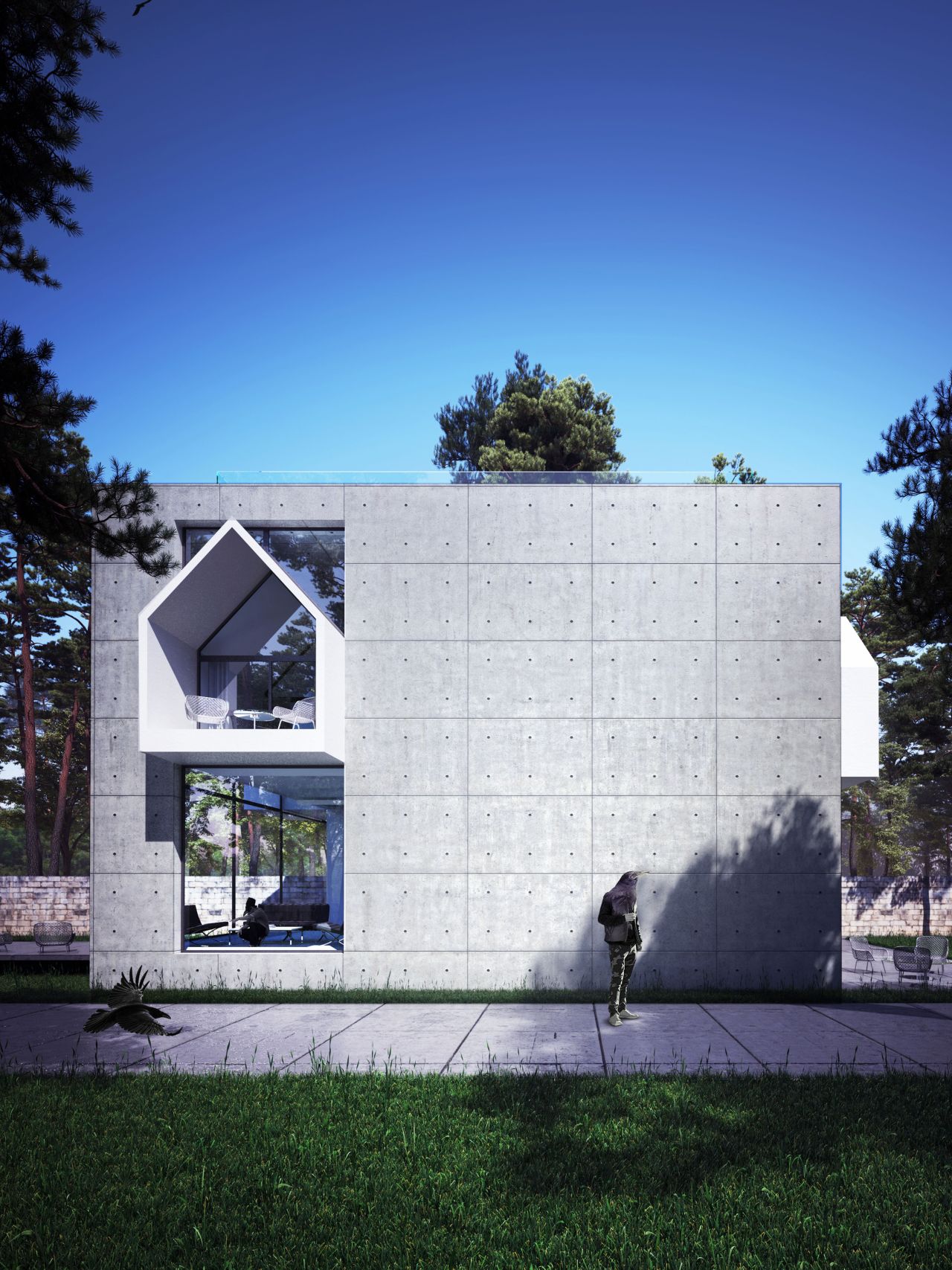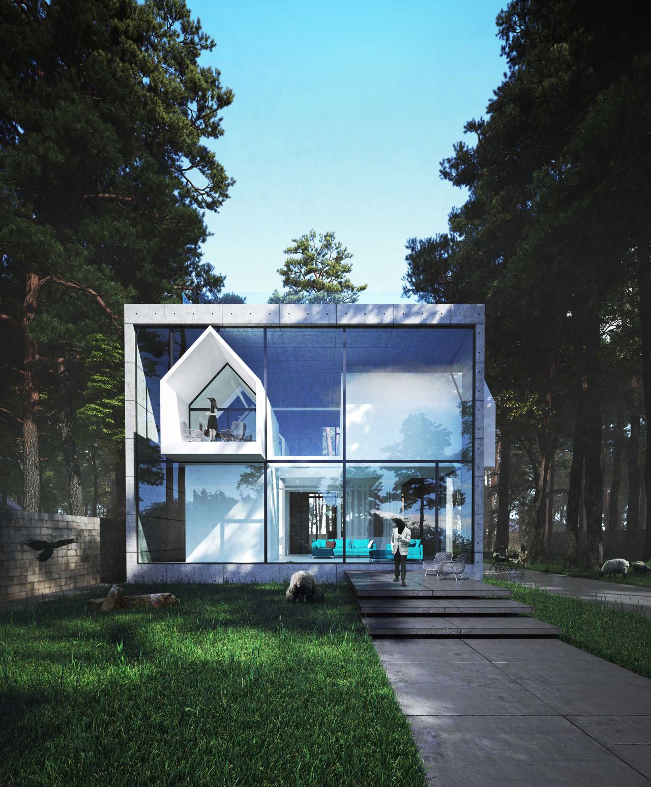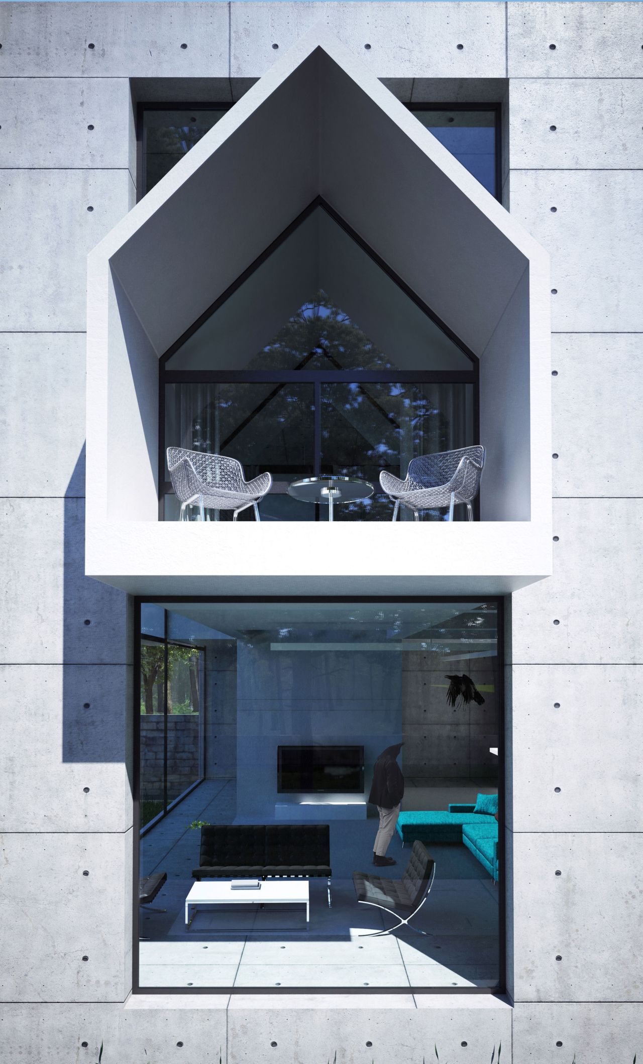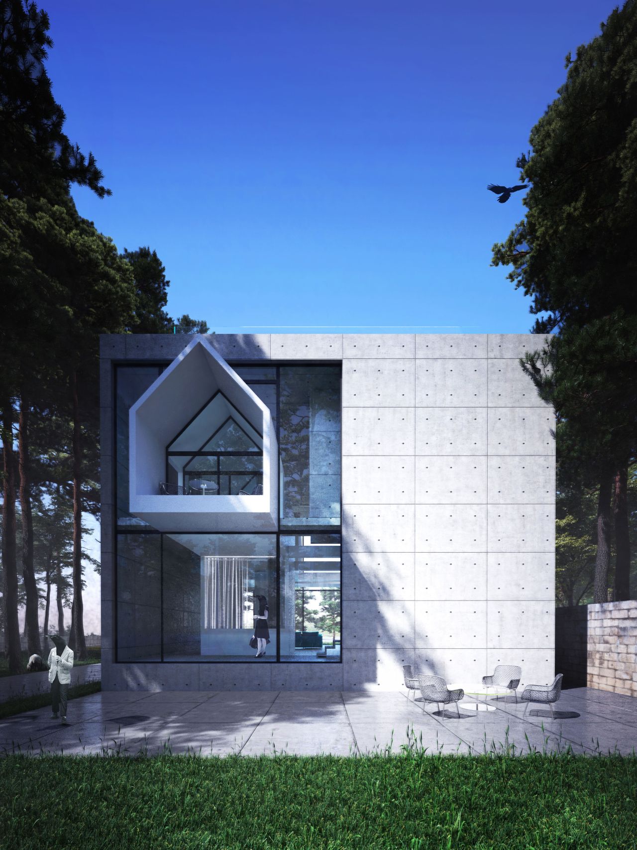 این بنا در دو طبقه به متراژ 450 متر مربع طراحی شده که بخش های عمومی در طبقه همکف و بخش های خصوصی در طبقه اول جانمایی شده است . توجه به استفاده از سقف های شیروانی با ماهیتی امروزی می تواند تصویر ذهنی و نوستالژیک از تجسم ساختمان های ویلایی منطقه را در یک قالب جدید برای ما شکل دهد .طراحی فضاهای سیال در تعامل با ساختار شیروانی پروژه تجربه حضور در یک فضای جذاب و خاطره انگیز را برا ما شکل می دهد پله سیال در طبقه همکف و یک پل معلق میان طبقات در طبقه اول بر سیالیت فضای داخلی پروژه افزوده است . تفکیک فضاهای عمومی و خصوصی و ارتباط دقیق شمالی و جنوبی بازشو ها برای به حداکثر رساندن فرصت تهویه طبیعی هوا از ویژگی های دیگر این ویلای مدرن و زیبا است . همچنین وجود پنجره ها و باز شو های بلند می تواند حداکثر ارتباط بصری با فضای سبز و طبیعت مقابل آن را پدید آورد .در این راستا کل فضای طبقه همکف به صورت فلت و یکسره طراحی شده و فقط یک آشپزخانه مرکزی و یک سرویس بهداشتی در ضلع غربی تعبیه شده است و هیچ فضای دیگری متراژ طبقه همکف را اشغال نکرده است در نتیجه ارتباط هال و نشیمن به صورت بی واسطه متراژی نزدیک به 200 متر مربع را شکل می دهندکه هم از سمت شمال و هم از سمت جنوب با بازشو هایی پانوراما , نور و تهویه هوا را به داخل هدایت می نمایند. این امکان این فرصت را برای ما فراهم می کند تا در روز های معمول سال با باز شدن پنجره های دو سوی شمالی و جنوبی ساختمان بیشترین میزان کوران هوا ممکن باشد و بدون نیاز به تاسیسات مکانیکی رطوبت محیط کاهش یابد .