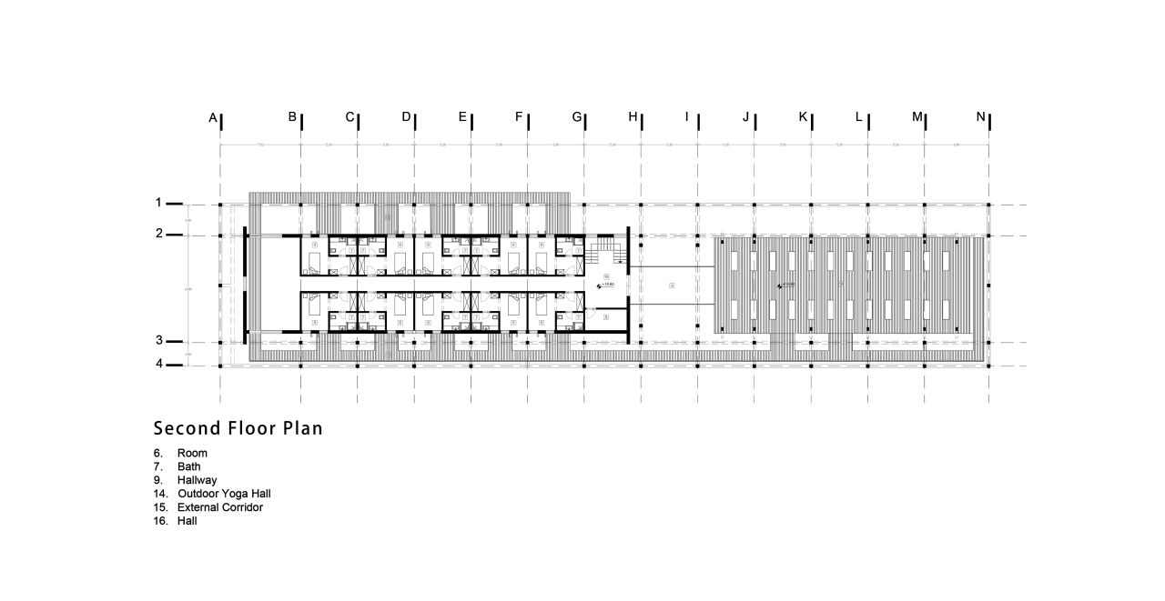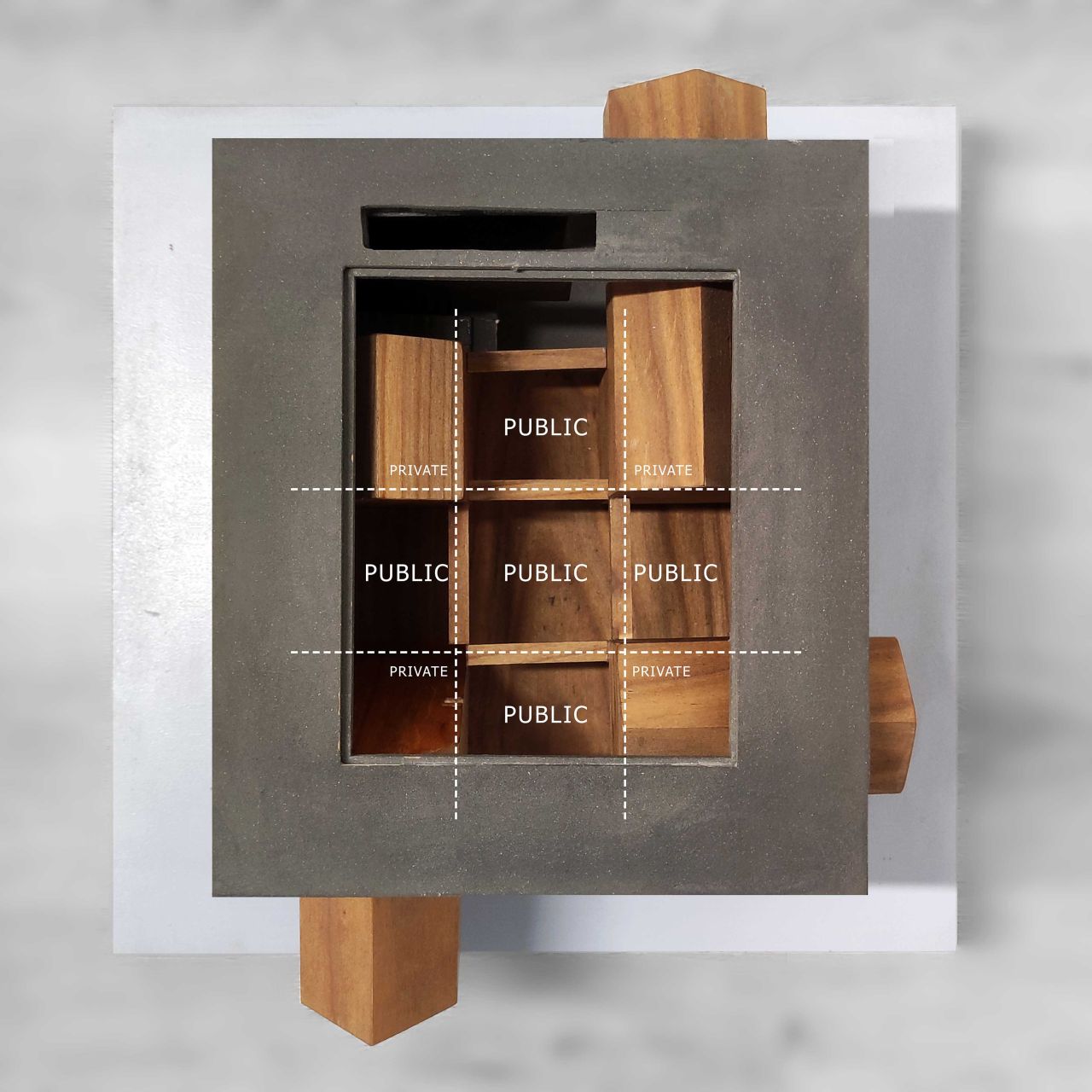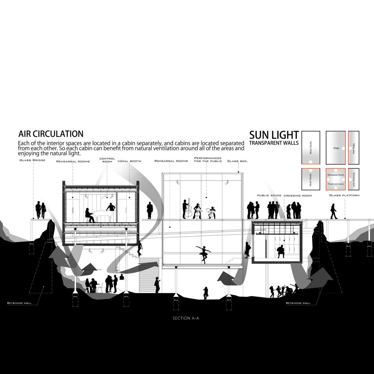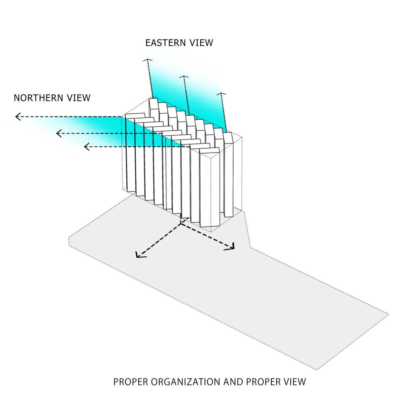 این پروژه از یک هسته مرکزی که در درون یک گرید سازه ایی قرار گرفته تشکیل شده است که هسته مرکزی در نقش فضاهای عملکردی میانی و گرید بیرونی به عنوان عنصر سازه ایی نقش ایفا می کند و در فضای میانی آن دو مسیر های حرکتی که تراس های حاشیه ایی را به هم متصل می کنند جانمایی شده است، این ساختار یک سازماندهی برونگرا را برای پروژ ایجاد می کند که هر اتاق را به صورت جداگانه به یک تراس بیرونی متصل می کند در نتیجه دسترسی به دید و منظر و استفاده از نور و تهویه مناسب را آسان میکند .