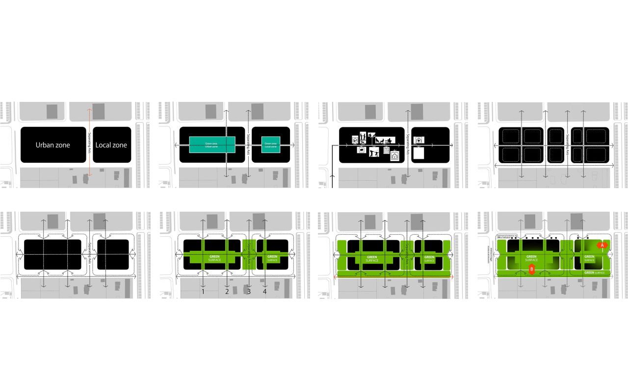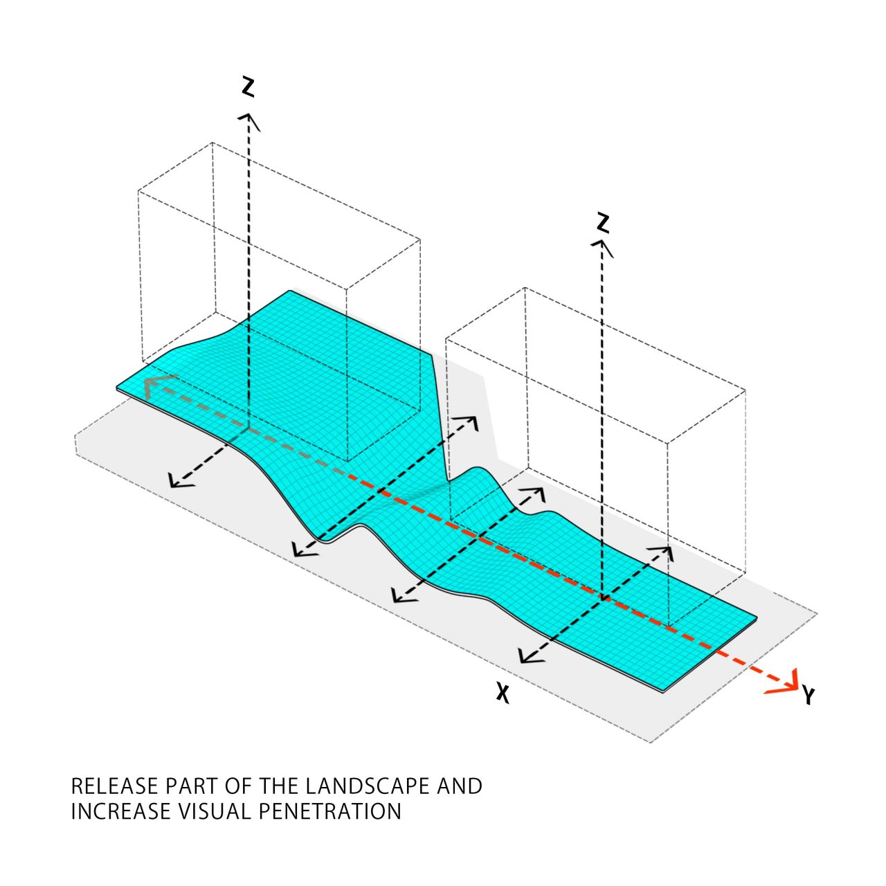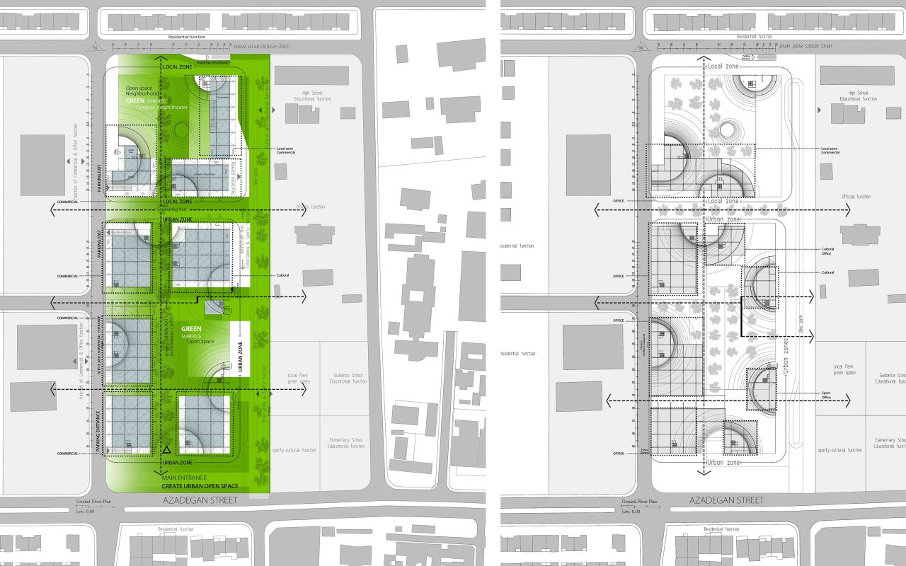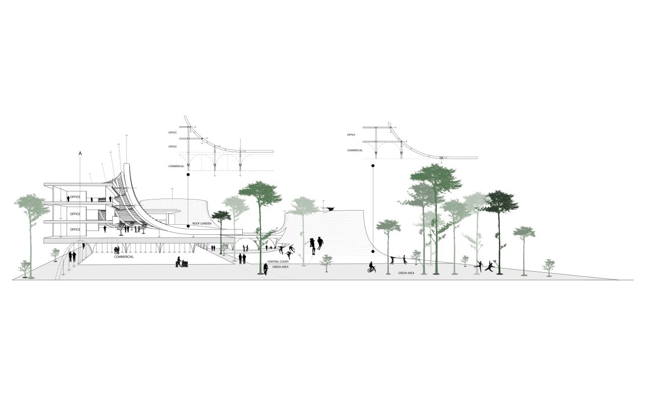 ایده ایجاد یک لنداسکیپ سینوسی دوم به موازات سطح زمین به تقویت لند اسکیپ از دست رفته کمک کرده و با انتقال حیاط ساختمان به ارتفاعات مختلف، سطح فضای سبز موجود را افزایش خواهد داد. در نتیجه پروژه به جای یک حیاط کوچک با یک حیاط بزرگتر و با ساختاری سینوسی جایگزین خواهد شد .