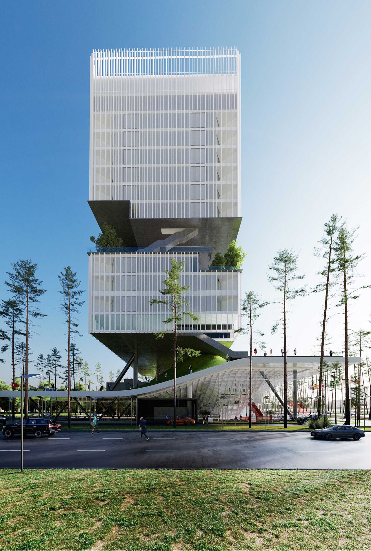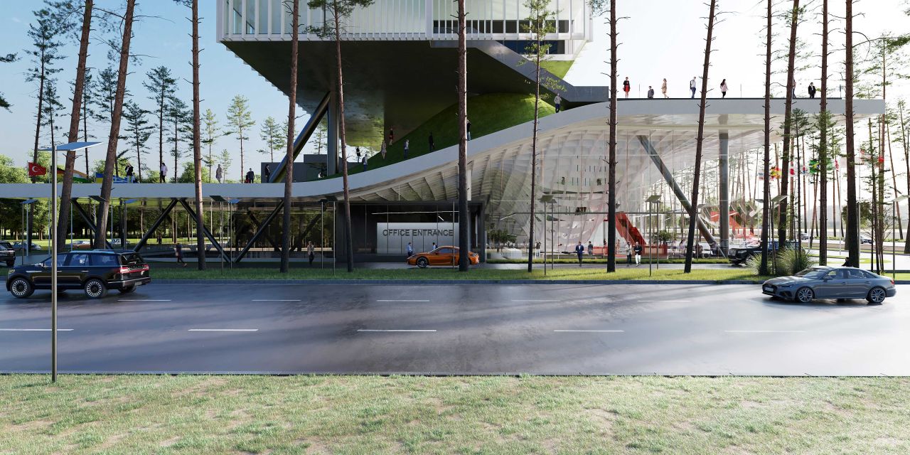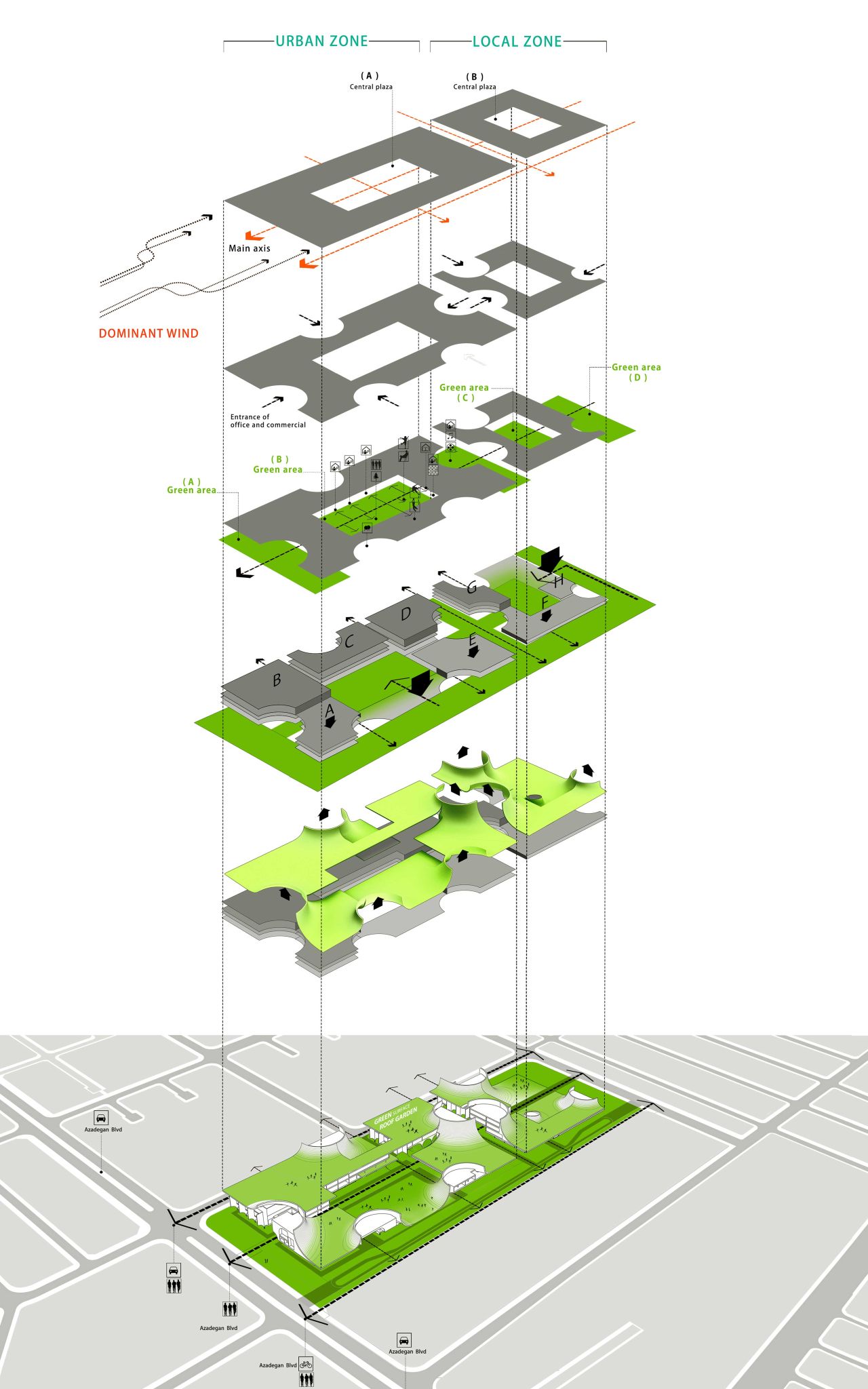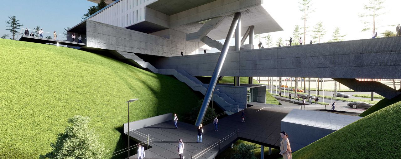 ایده ایجاد یک لنداسکیپ سینوسی دوم به موازات سطح زمین به تقویت لند اسکیپ از دست رفته کمک کرده و با انتقال حیاط ساختمان به ارتفاعات مختلف، سطح فضای سبز موجود را افزایش خواهد داد. در نتیجه پروژه به جای یک حیاط کوچک با یک حیاط بزرگتر و با ساختاری سینوسی جایگزین خواهد شد .