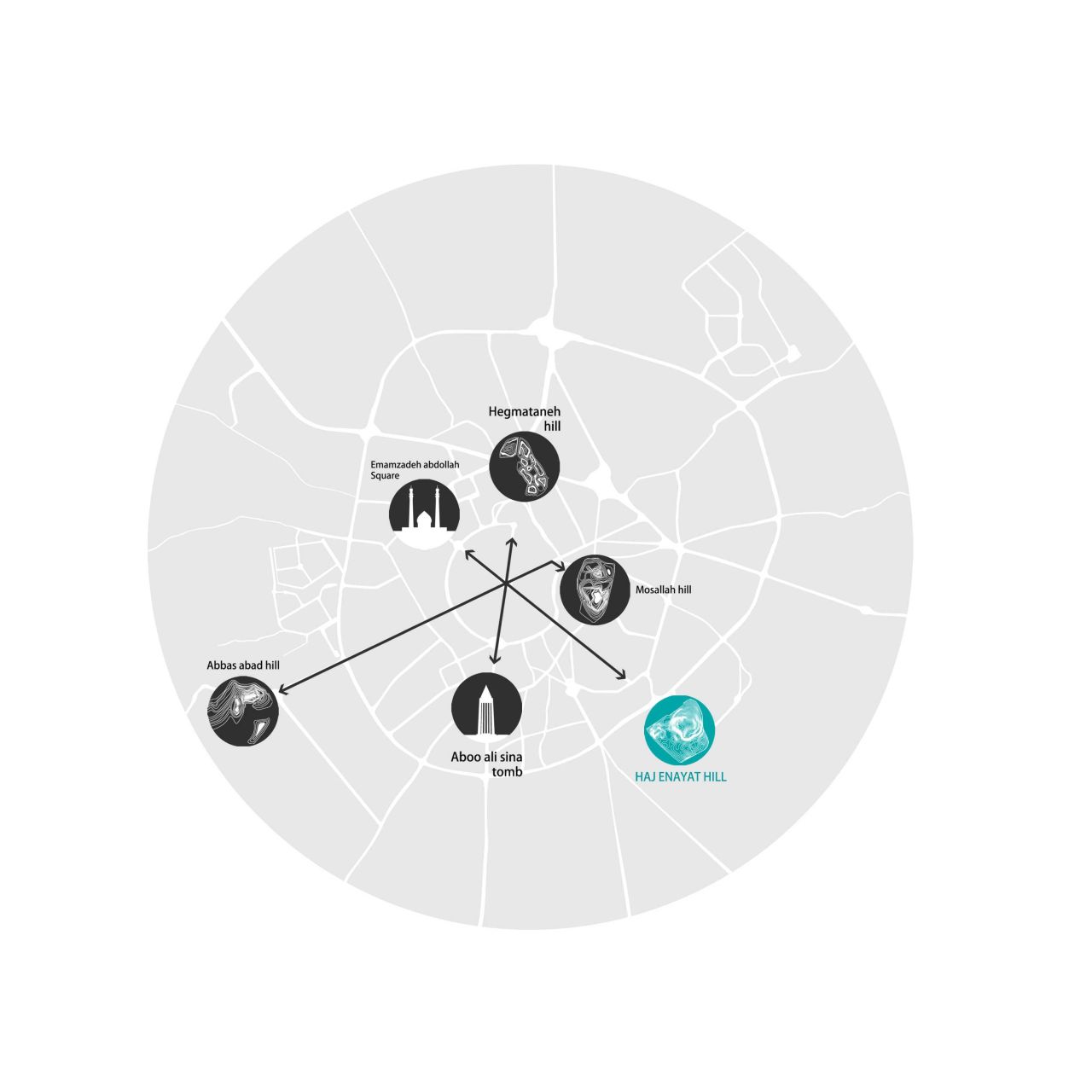 همانطور هم که می دانیم از منظر شهری و به خصوص شناخت شناسی شهری , شهر تلفیقی از عناصر قوی ( نشانه ها ) و عناصر خنثی است . که شهر همدان (بعد از سال 1332) را می توان با چند نشانه قوی متشکل از یک میدان مرکزی( هسته شهر ) و شش بازوی حاشیه آن تجسم کرد که محله ها در میان آن گسترش یافته اند . ولی آنچه این شناخت را کامل می کند جانمایی گونه ای از نشانه های شهری قدرتمند در امتداد هر یک از این محور های شهریست . برخی از این نشانه ها بناهای ارزشمند شهری ( نشانه های مصنوع ) و برخی از آنها تپه ها و عوارض جغرافیایی شهر ( نشانه های طبیعی ) هستند .