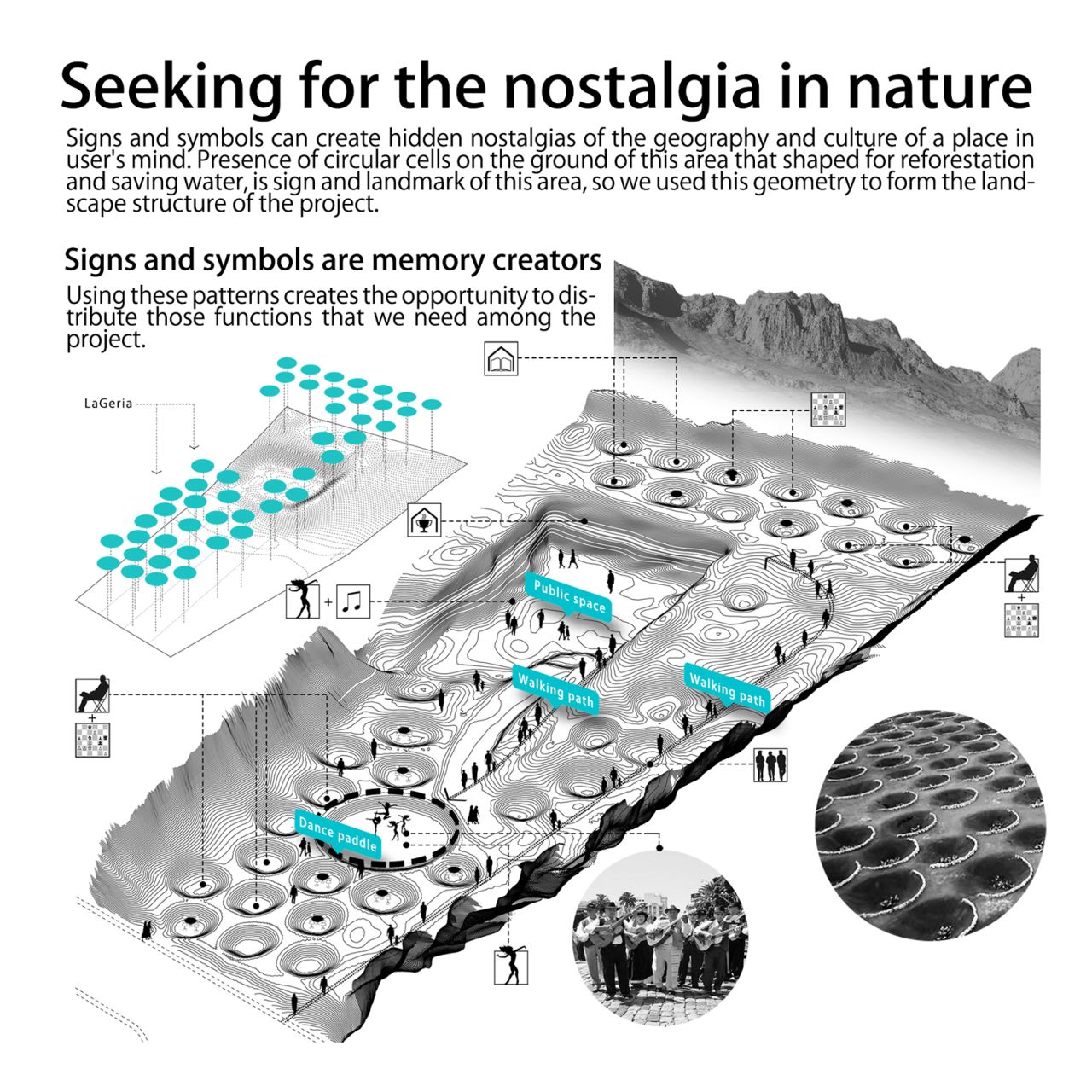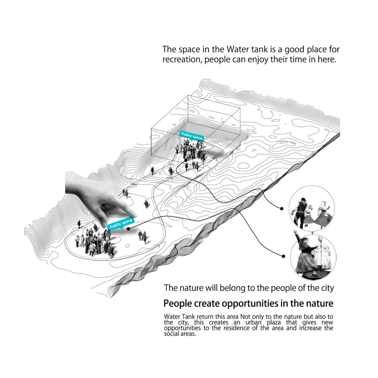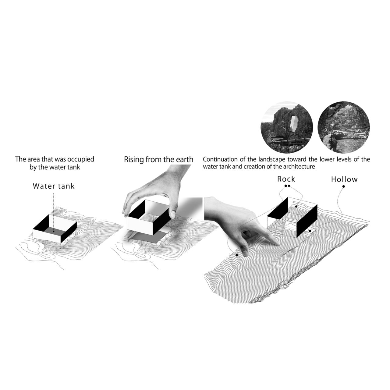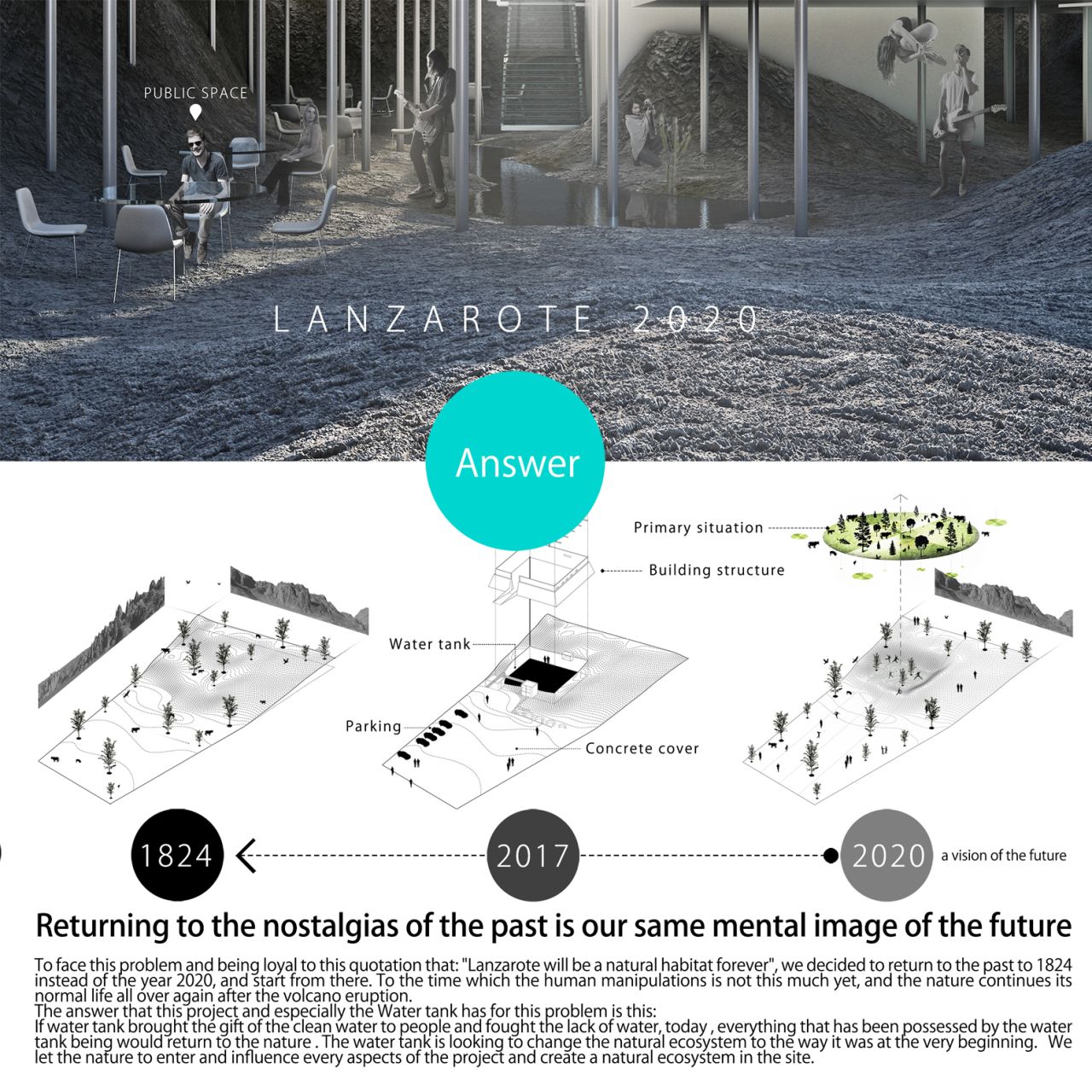 برای رویارویی با این مسئله و پایبندی به این شعار که لانزاروته برای همیشه یک زیستگاه طبیعی خواهد بود , تصمیم میگیریم که به جای برنامه ریزی برای سال 2020 , برعکس به گذشته سفر کنیم , به سال 1824 و از انجا شروع کنیم , زمانی که مداخلات بشرهنوز گسترده نشده و طبیعت پس از سپری شدن حوادث فوران آتشفشانی زندگی عادی خود را از نوع شروع کرده بود .پاسخی که این پروژه و بویژه واتر تانک به این سوال خواهد داد این است که اگر واتر تانک روزی آب را به مردم منطقه هدیه و با معضل کم آبی مقابله می کرد , امروز زمین و هر آنچه را که سالها از طبیعت تصرف کرده بود را به طبیعت باز خواهد گرداند و آن را به همان شکل اولیه و اکوسیستم طبیعی خود تبدیل خواهد کرد . در نتیجه به طبیعت اجازه خواهیم داد تا به تمام اجزای پروژه نفوذ نماید و یک اکوسیستم طبیعی را در درون سایت شکل دهد .