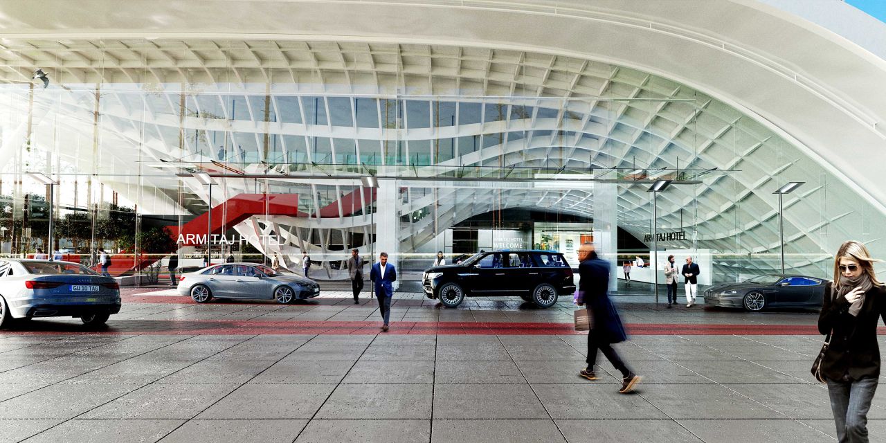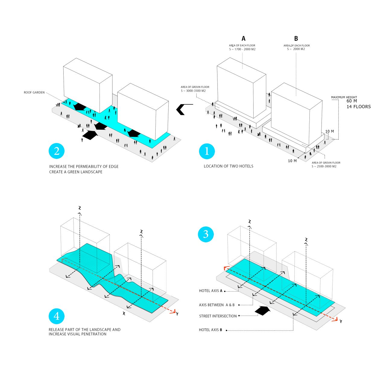 با جانمایی توده اولیه هتلها بر اساس ضوابط و استانداردهای موجود، با ساختاری روبرو خواهیم بود که هم در ارتفاع و هم در سطح اشغال طبقه همکف با یک توده یکپارچه و کم نفوذ روبرو خواهیم بود، در نتیجه ارتباط و تعامل سایت مجموعه با محیط شهری آن به حداقل خواهد رسید .