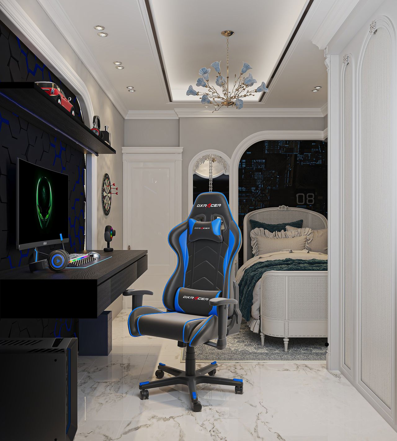 تفکیک عملکردی فضا بهصورت واضح انجام شده است؛ بهگونهای که بخش خواب با فرمی آرام و کلاسیک طراحی شده و بخش مطالعه و گیمینگ با متریال تیرهتر و نورپردازی متمرکز، حس مدرن و پویاتری دارد. نورپردازی سقف با استفاده از نور مخفی و هالوژنهای توکار، در کنار لوستر با طراحی ظریف، به تعادل میان شکوه کلاسیک و سادگی مدرن کمک کرده است.