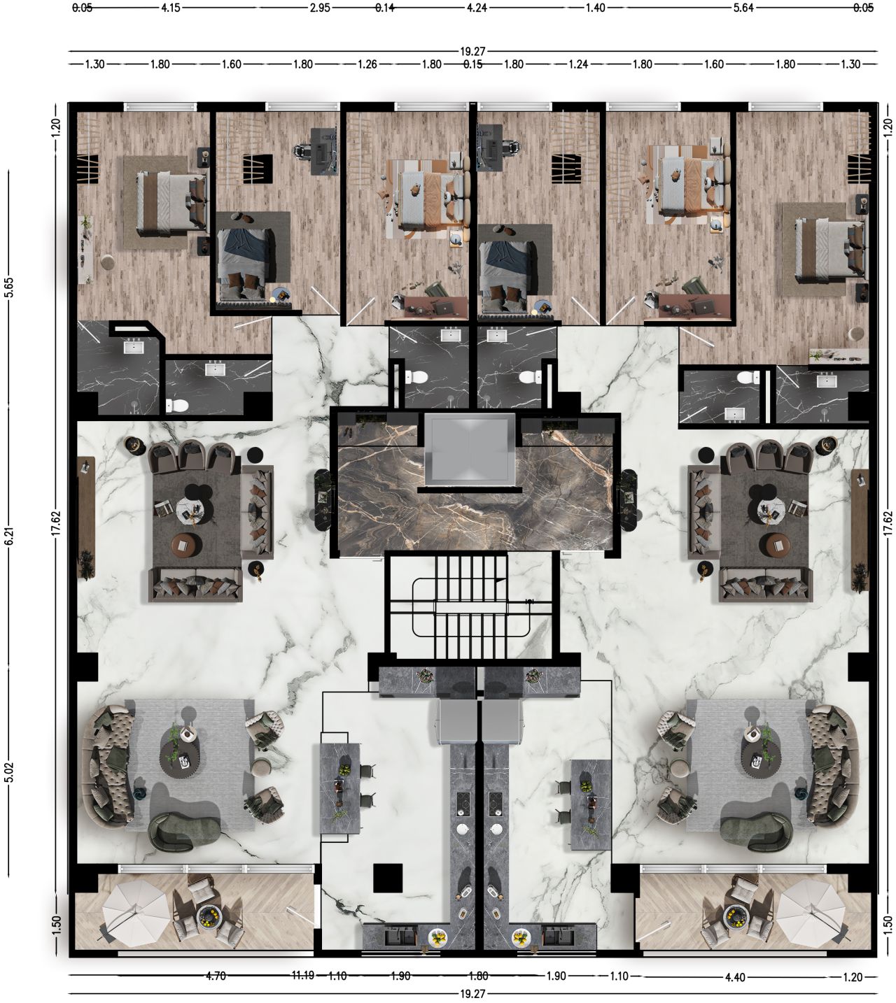 این پلان بهصورت گرافیکی با نرمافزار فتوشاپ کارشده و با هدف ارائهی خوانا و واقعگرایانه از فضاهای داخلی طراحی شده است. سبک کلی پروژه مدرن بوده و بر اساس سادگی فرم، نظم فضایی و استفاده از متریالهای امروزی شکل گرفته است. ترکیب کفپوشهای طرح سنگ روشن با چوب، ایجاد کنتراست ملایم و حس لوکس و آرام را تقویت کرده است. فضاها بهصورت متقارن و منطقی سازماندهی شدهاند و ارتباط مناسبی بین بخشهای خصوصی و عمومی برقرار است. نورگیری مناسب، مبلمان مینیمال و رنگهای خنثی از ویژگیهای شاخص این طراحی هستند که در کنار هم، فضایی مدرن، کاربردی و چشمنواز ایجاد کردهاند.