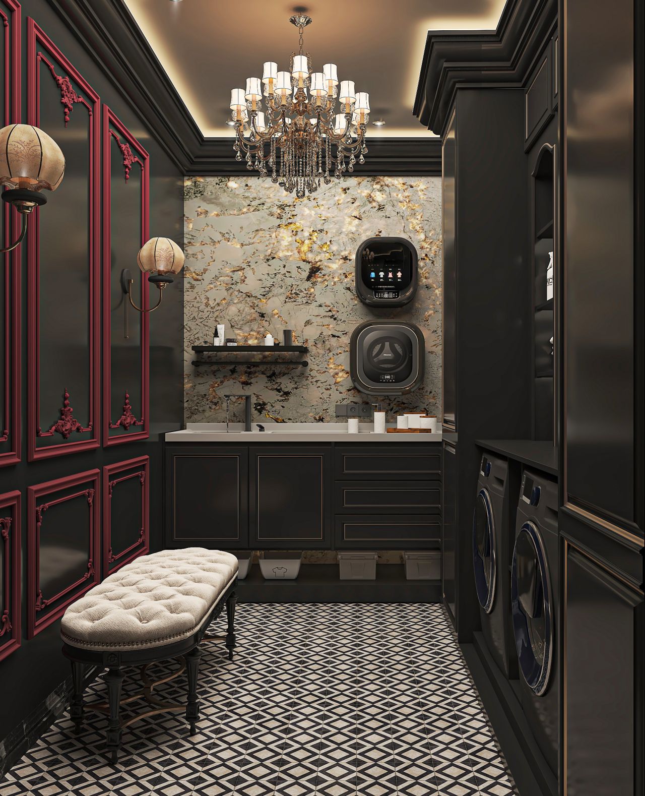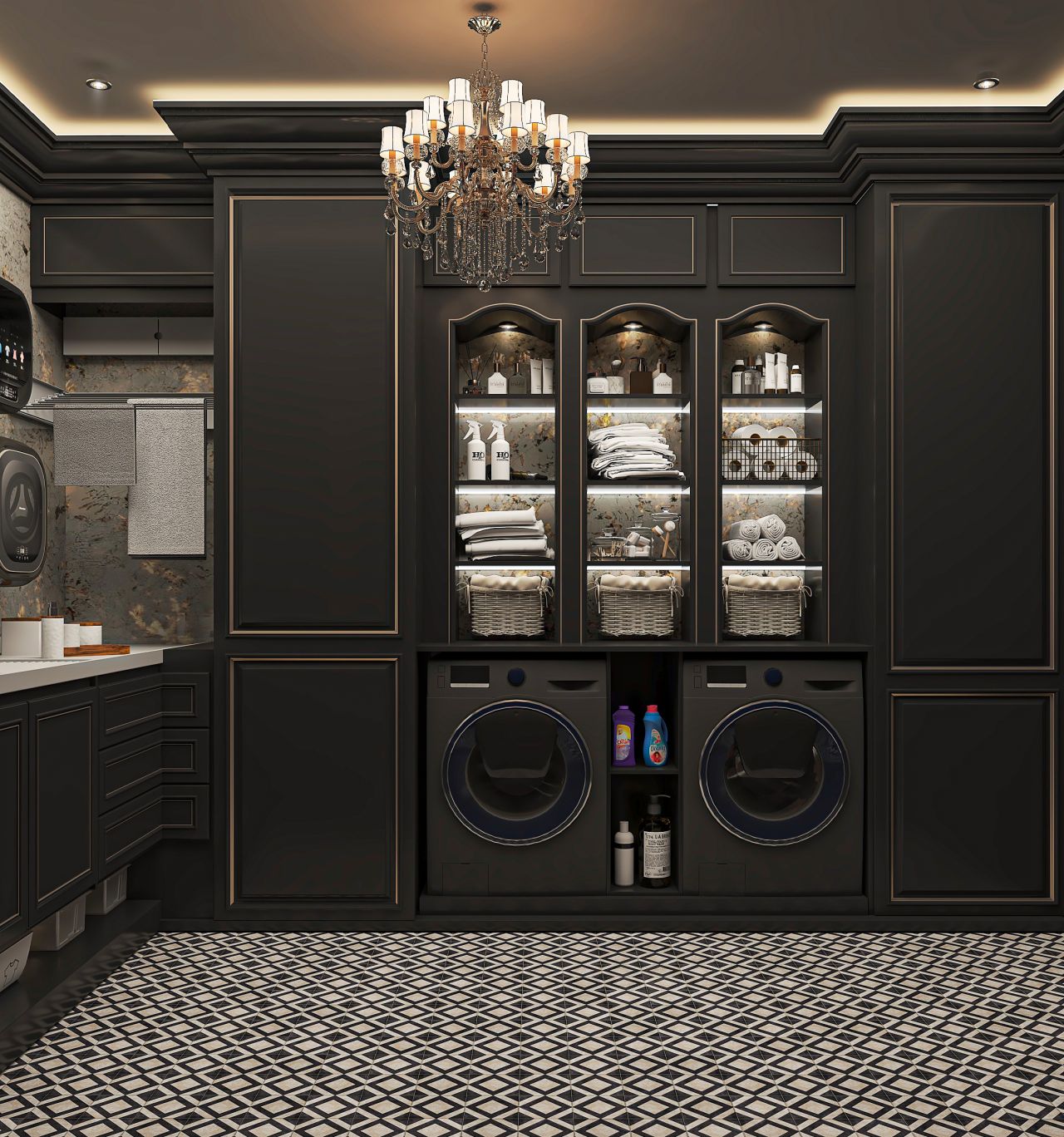 چیدمان تجهیزات لاندری از جمله ماشین لباسشویی و خشککن بهصورت توکار و منظم انجام شده تا در عین کارایی بالا، نظم بصری و یکپارچگی طراحی حفظ شود. کفپوش با الگوی هندسی کلاسیک نیز هماهنگ با سبک کلی فضا انتخاب شده و به پویایی بصری محیط کمک میکند.