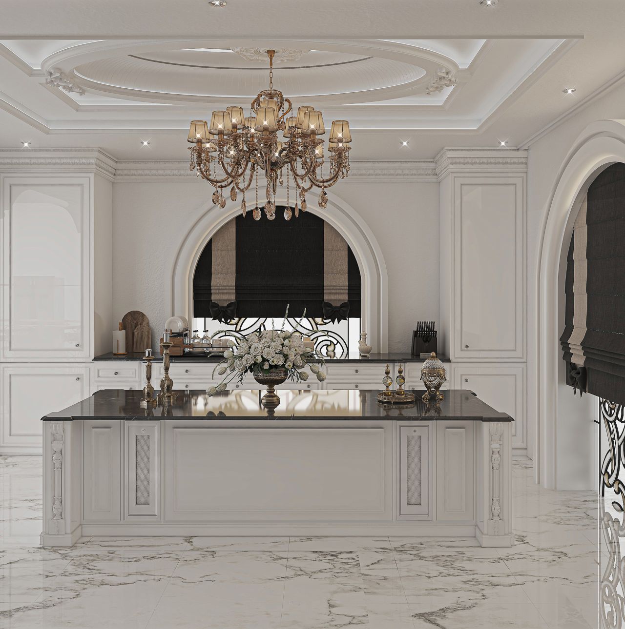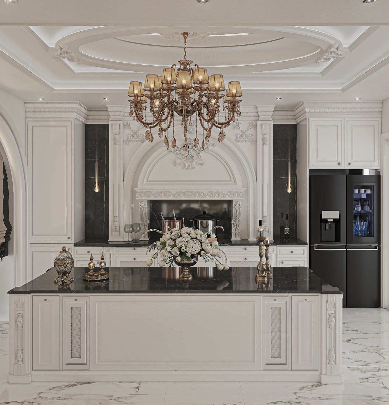 در مرکز فضا، جزیرهی آشپزخانه با کابینتهای قابدار کلاسیک و صفحهی سنگی تیره (مرمر ) قرار دارد که کنتراست زیبایی با بدنهی روشن ایجاد کرده است. استفاده از تزئینات ظریف، قاببندیها و ابزارهای فلزی کلاسیک، حس اشرافیت را تقویت میکند.