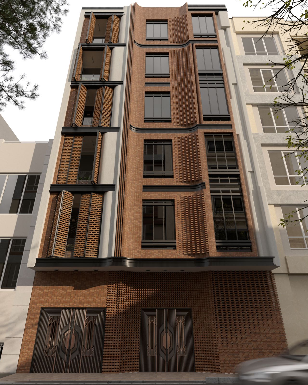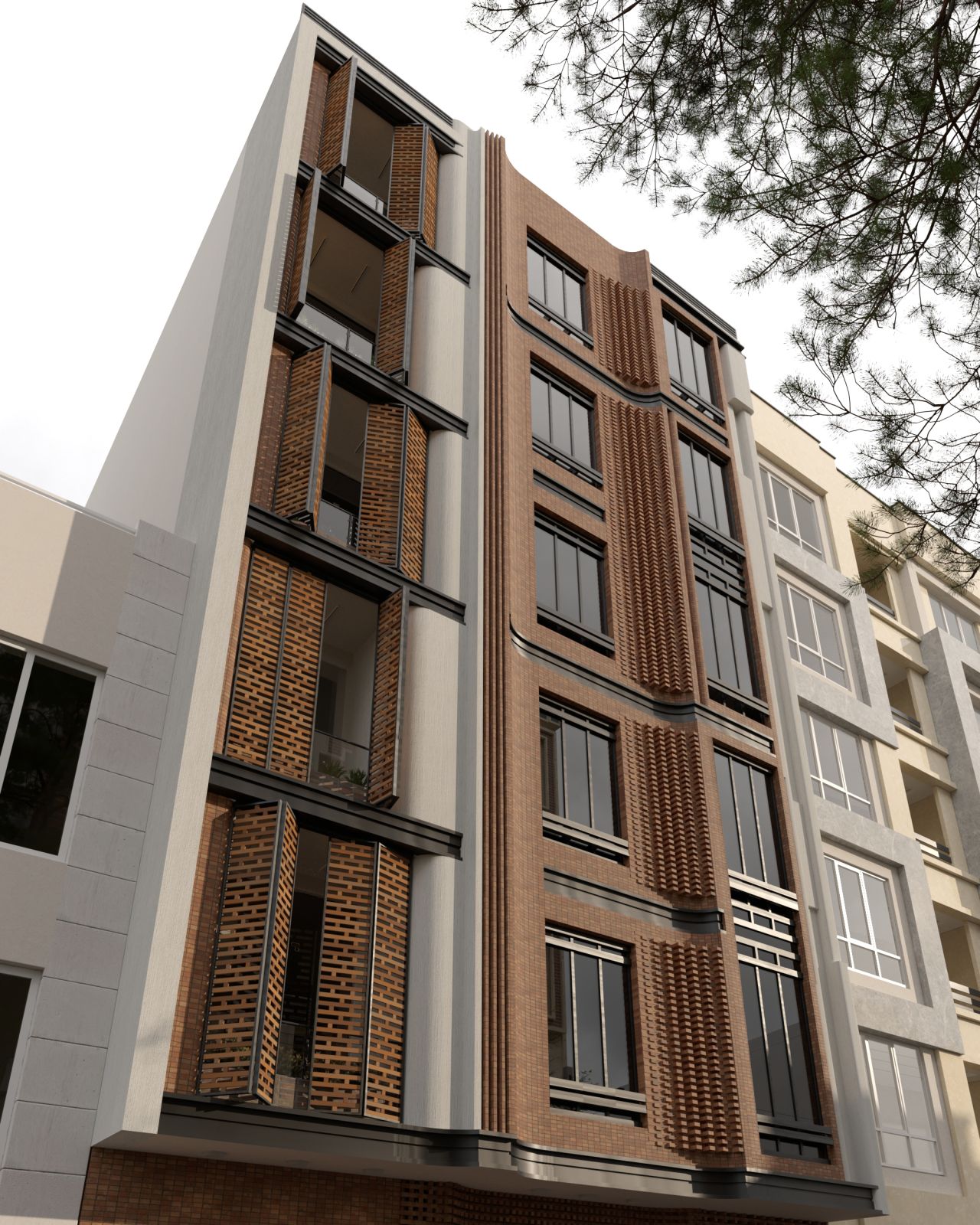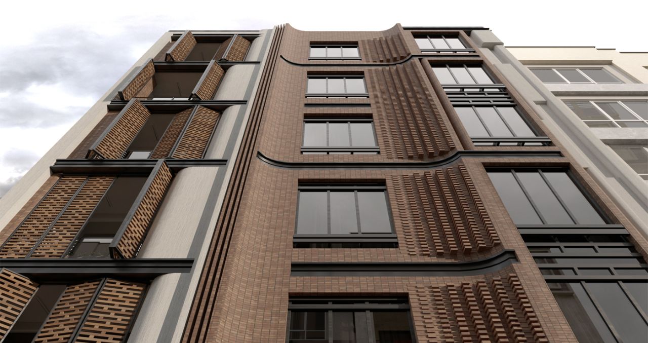 طراحی ترکیبی سنتی و مدرن با مصالح آجر/ سیمان و بالکن کرکره ای