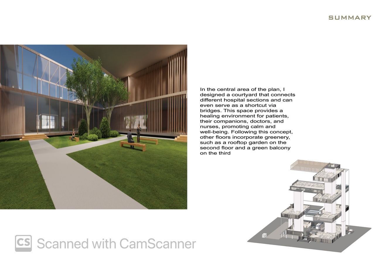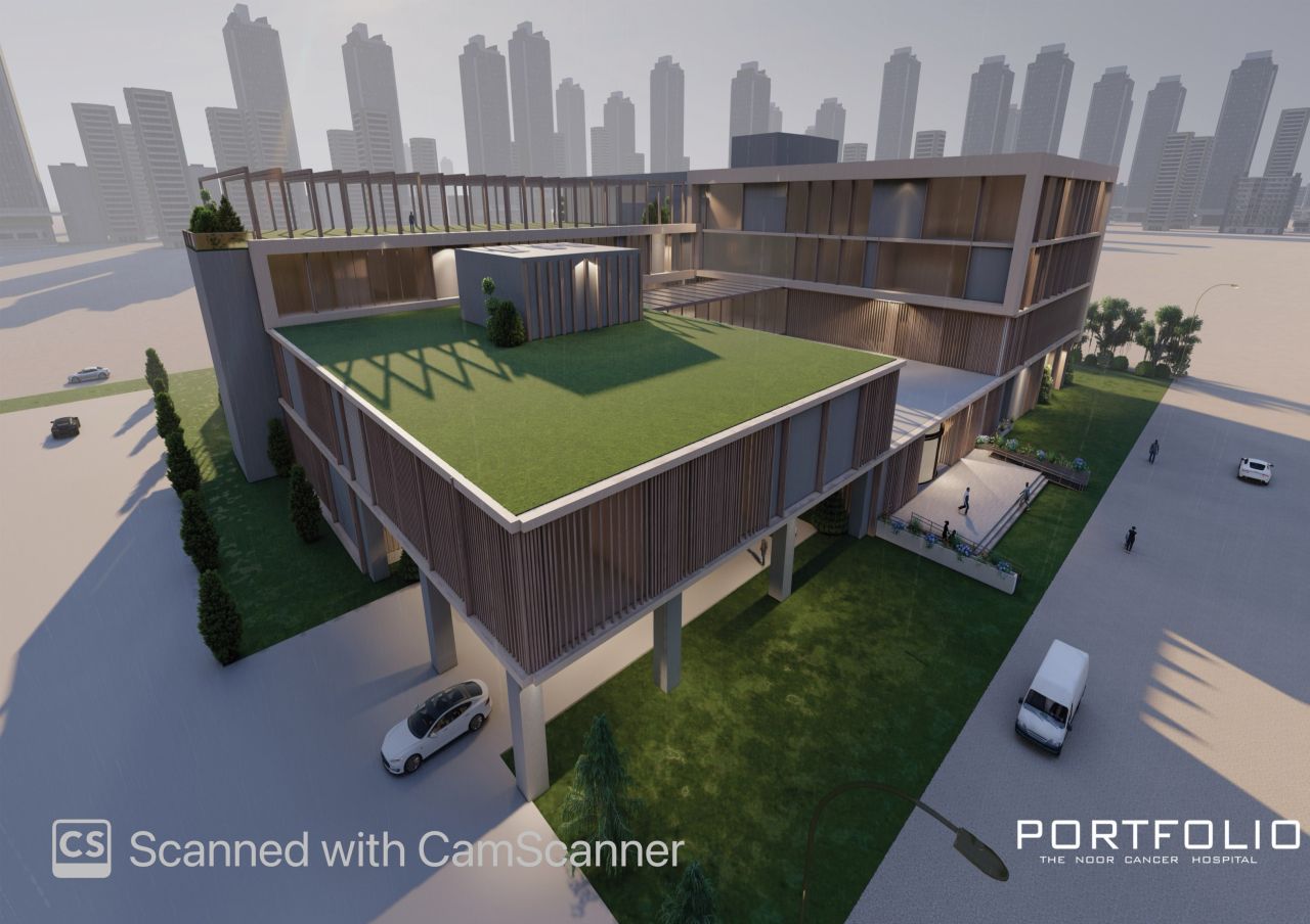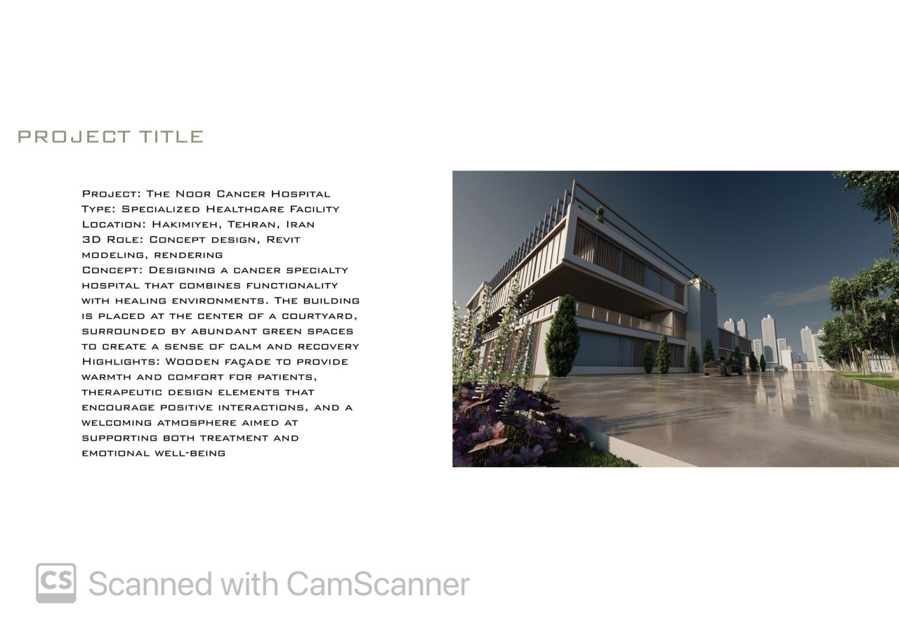 این پروژه در قالب درس طرح 4 کارشناسی و با استفاده از نرم‌افزار Revit طراحی شده است. در فرآیند طراحی، تمرکز اصلی بر نیازهای جسمی و روانی بیماران مبتلا به سرطان و همراهان آن‌ها بوده است. تلاش شده فضاهایی آرام، نورگیر و انسانی در تمامی بخش‌ها ایجاد شود تا ضمن پاسخ‌گویی به عملکردهای درمانی، به حفظ روحیه بیماران نیز کمک کند. کانسپت اصلی طراحی بر پایه حضور طبیعت و فضای سبز شکل گرفته است؛ به‌گونه‌ای که ارتباط بصری و فیزیکی با فضای سبز در بخش‌های مختلف پروژه لحاظ شده و محیطی آرامش‌بخش و امیدآفرین فراهم گردد. سازماندهی فضایی، نور طبیعی، دید و کیفیت محیطی، از عناصر کلیدی در شکل‌گیری این طرح بوده‌اند.