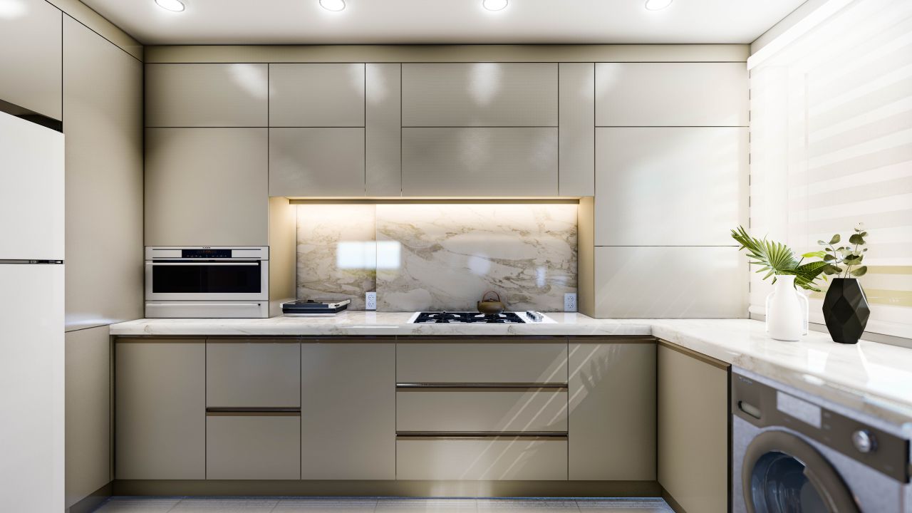 کابینتها با طراحی یکپارچه و خطوط ساده اجرا شدهاند و استفاده از فضاهای عمودی و جانمایی دقیق تجهیزات، باعث شده سطح کار مناسب و فضای ذخیرهسازی کافی فراهم شود. نورپردازی نیز به صورت کاربردی و متعادل طراحی شده تا رنگهای بژ و بافت متریالها جلوه بهتری داشته باشند.