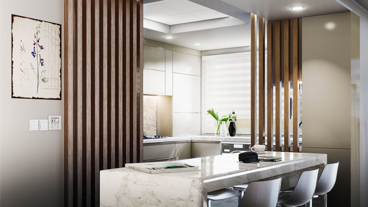 پروژه طراحی آشپزخانه این واحد 120 متری در رشدیه با تمرکز بر ایجاد فضایی گرم، متعادل و کاربردی شکل گرفت. با توجه به ابعاد نسبتاً محدود آشپزخانه، طراحی بهگونهای انجام شد که ضمن حفظ سادگی، بیشترین بهرهوری از فضا فراهم شود و محیط منظم و هماهنگ باقی بماند.
